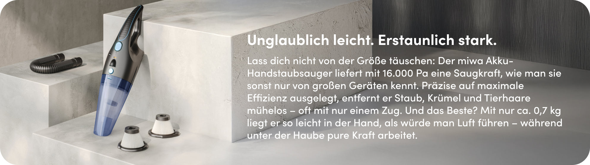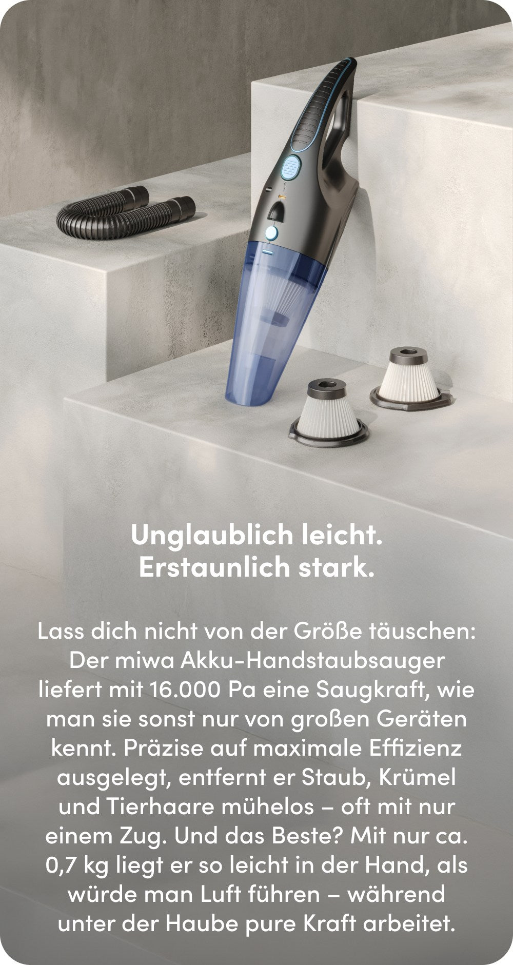Der miwa Handstaubsauger liefert maximale Power im minimalen Format. Ein starker Motor, ein ausdauernder Akku und intelligente Filtertechnologie stecken in diesem Gerät, das dir das Reinigen so einfach macht, dass du kaum noch darüber nachdenken musst – und so effektiv arbeitet, dass du nie wieder etwas anderes willst.