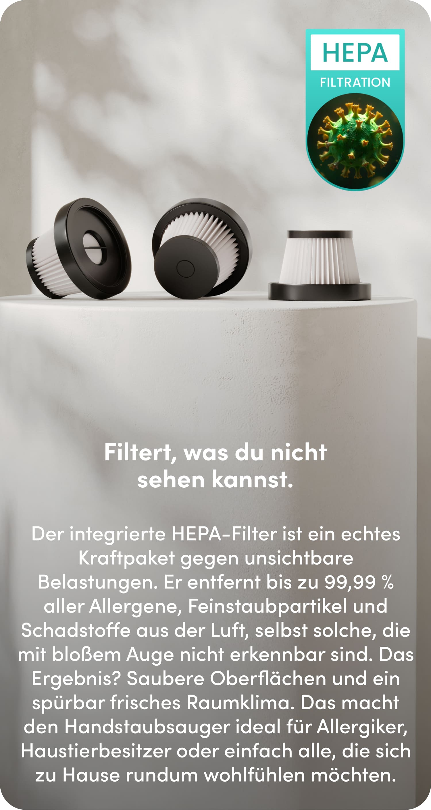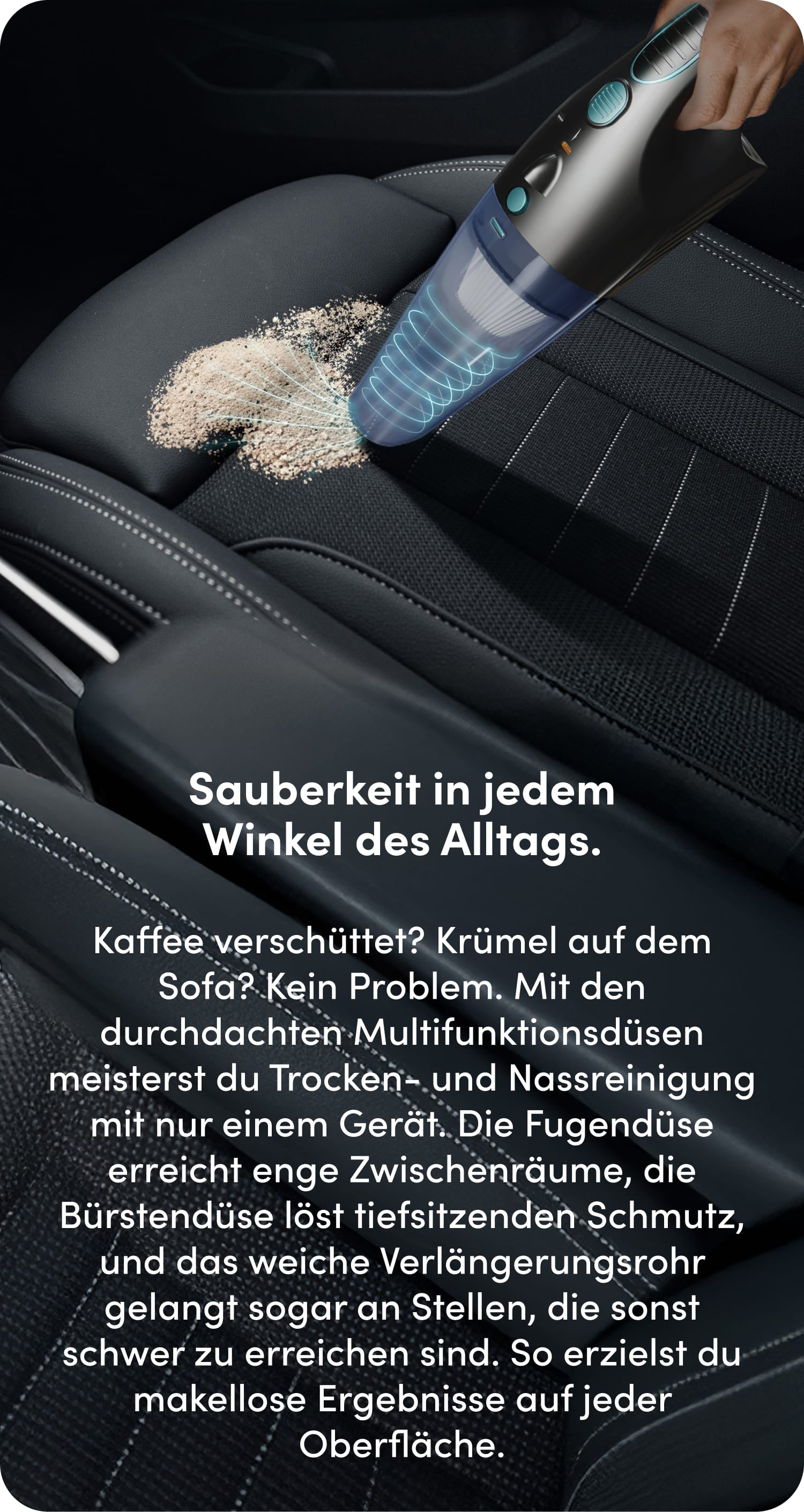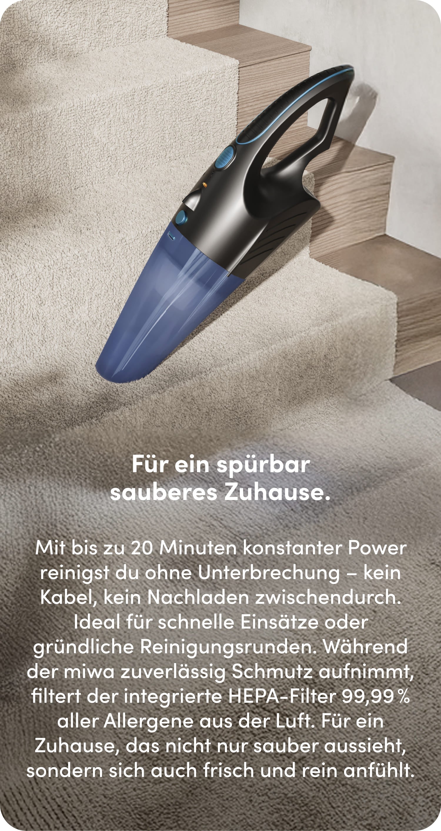 Der miwa Handstaubsauger liefert maximale Power im minimalen Format. Ein starker Motor, ein ausdauernder Akku und intelligente Filtertechnologie stecken in diesem Gerät, das dir das Reinigen so einfach macht, dass du kaum noch darüber nachdenken musst – und so effektiv arbeitet, dass du nie wieder etwas anderes willst.