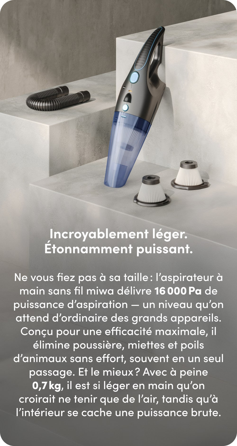 L'aspirateur à main sans fil miwa fournit une puissance maximale dans un format minimal. Un moteur puissant, une batterie endurante et une technologie de filtrage intelligente se trouvent dans cet appareil qui te facilite tellement le nettoyage que tu n'as presque plus besoin d'y penser - et qui fonctionne si efficacement que tu ne voudras plus jamais autre chose.