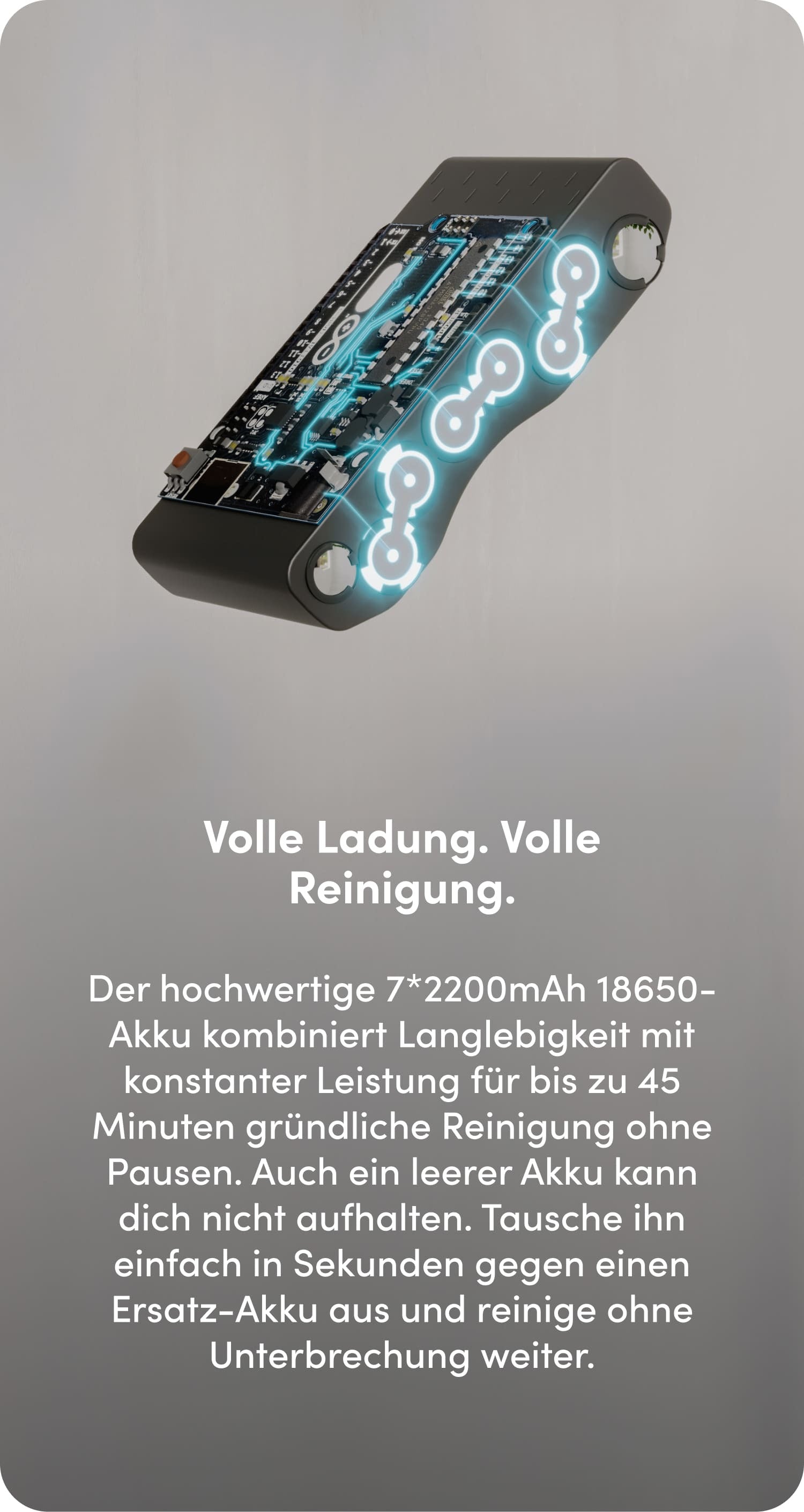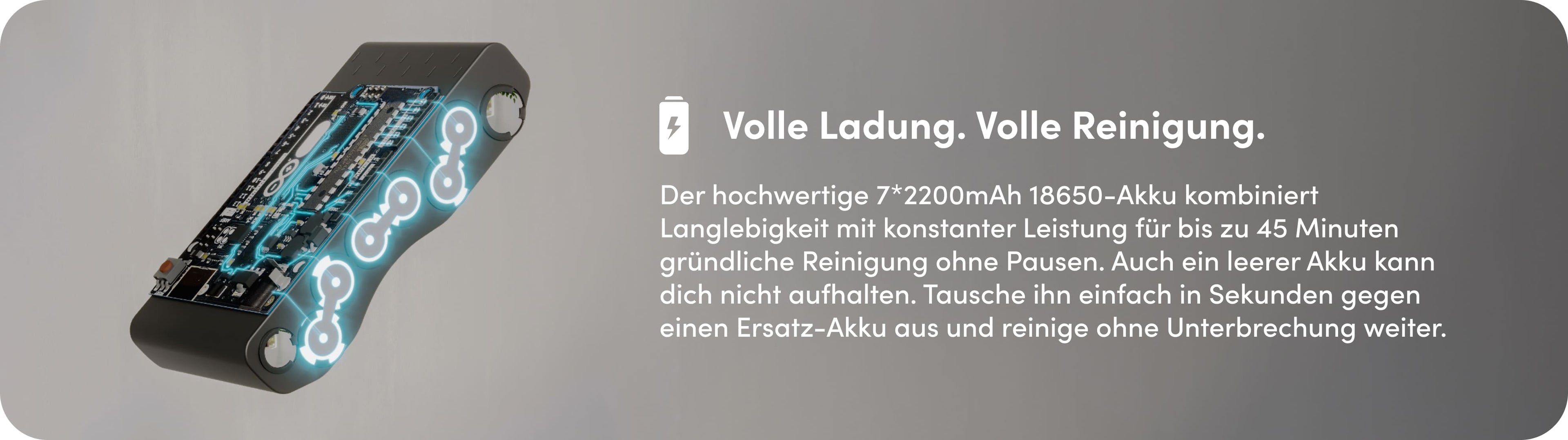 - Ohne Ladepause weitermachen – Akku wechseln und sofort weiterreinigen