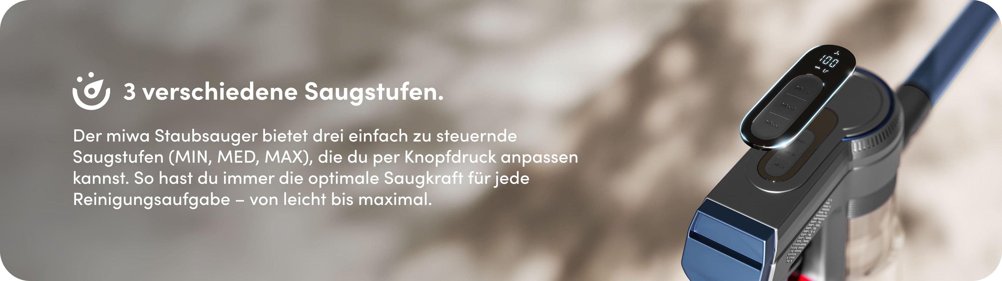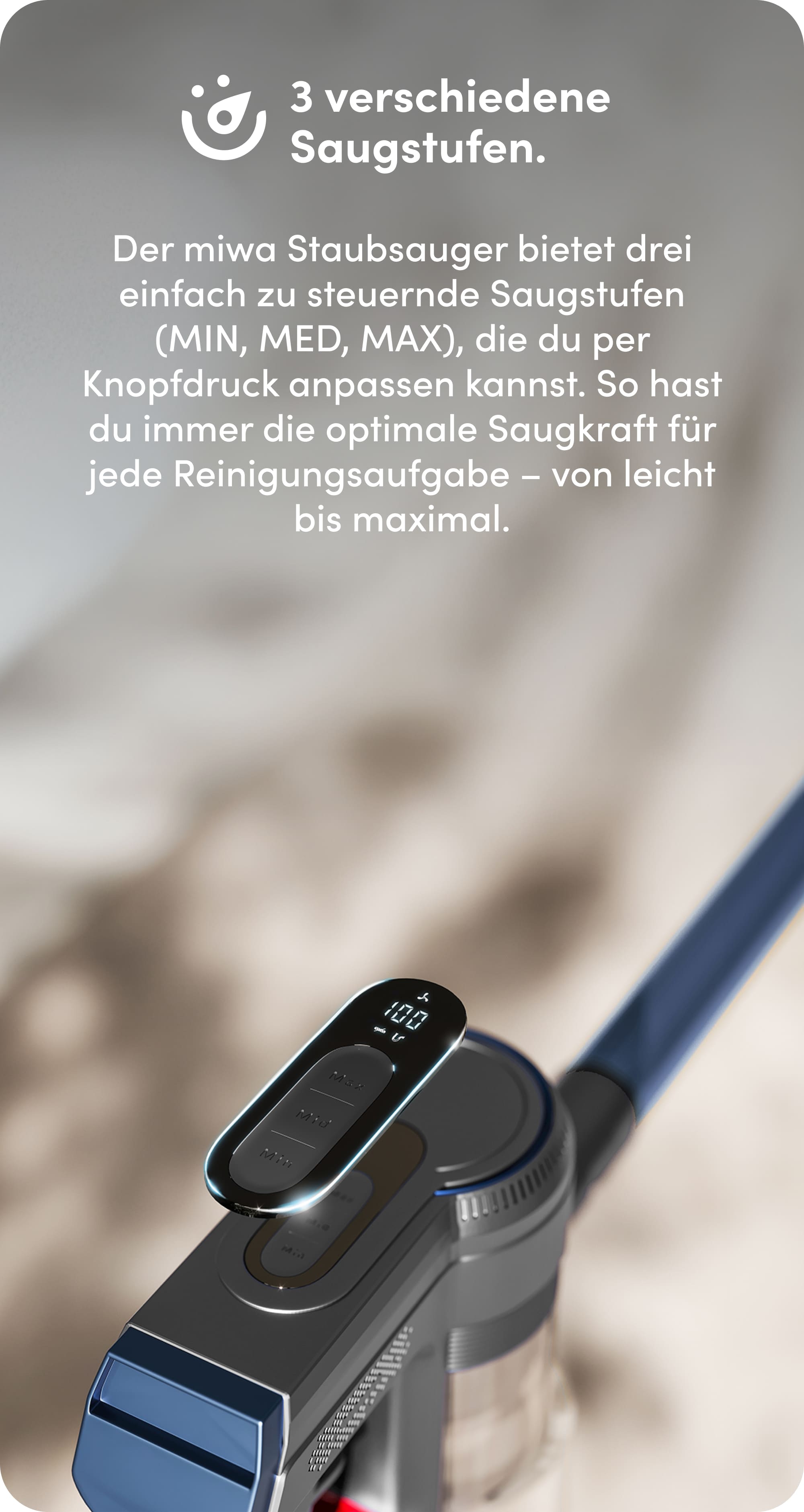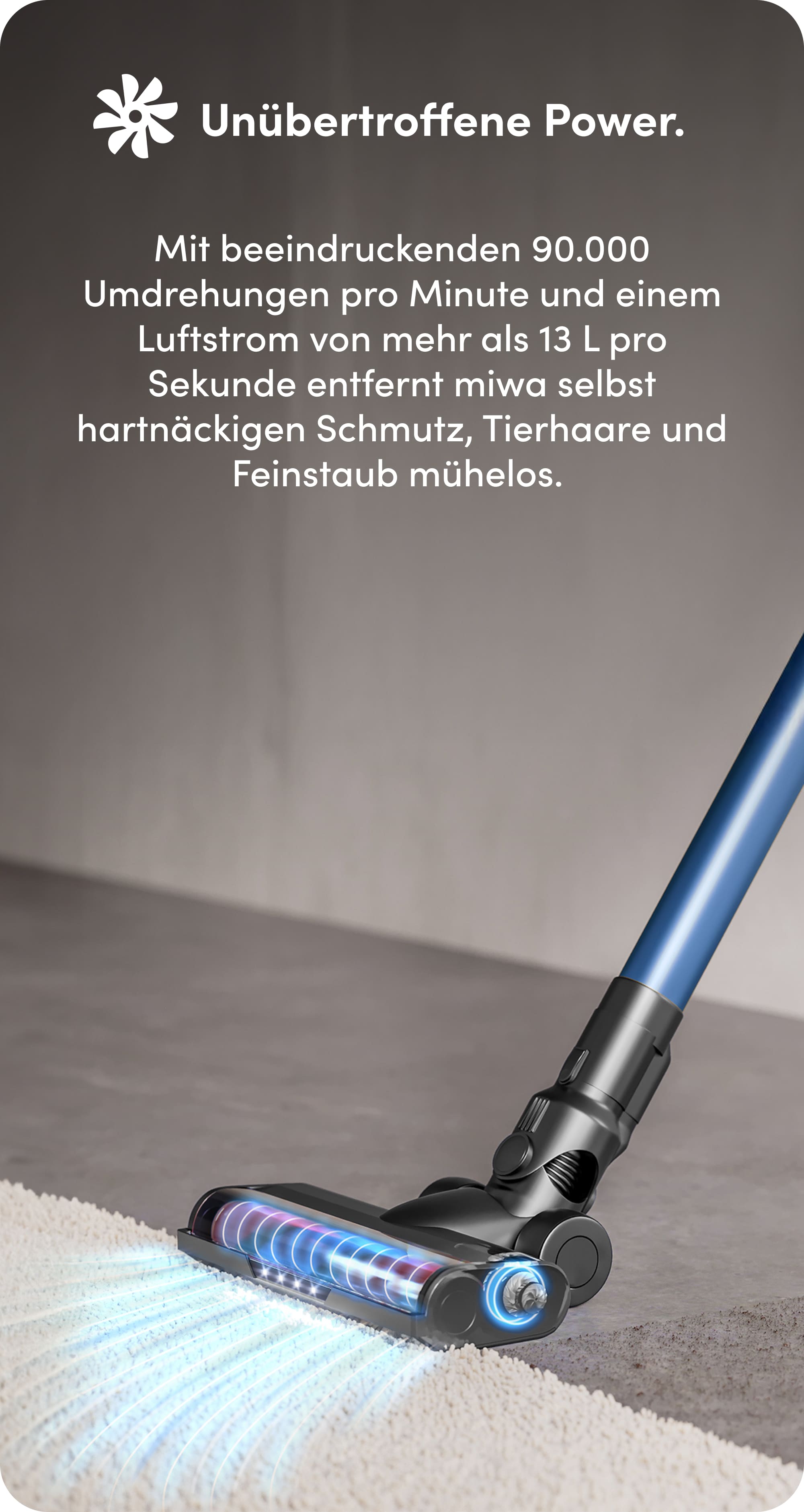 Der miwa vereint kraftvolle Leistung, modernes Design und durchdachte Technologien in einem Gerät. Mit kabelloser Freiheit, einem innovativen HEPA-Filtersystem und vielseitigen Aufsätzen macht er jede Reinigungsaufgabe so einfach, wie sie sein sollte. Für ein Zuhause, das so gut aussieht, wie es sich anfühlt.