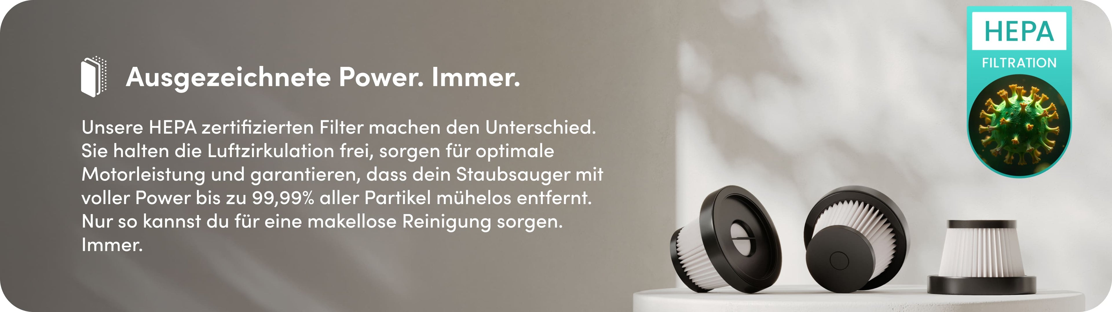 Der Filter des miwa sollte alle zwei Wochen gereinigt werden, um die maximale Saugkraft und Effizienz zu erhalten. Für eine optimale Leistung empfehlen wir, den Filter jeden Monat auszutauschen. So bleibt dein Staubsauger in Bestform, und dein Zuhause strahlt mit spürbar sauberer Luft.