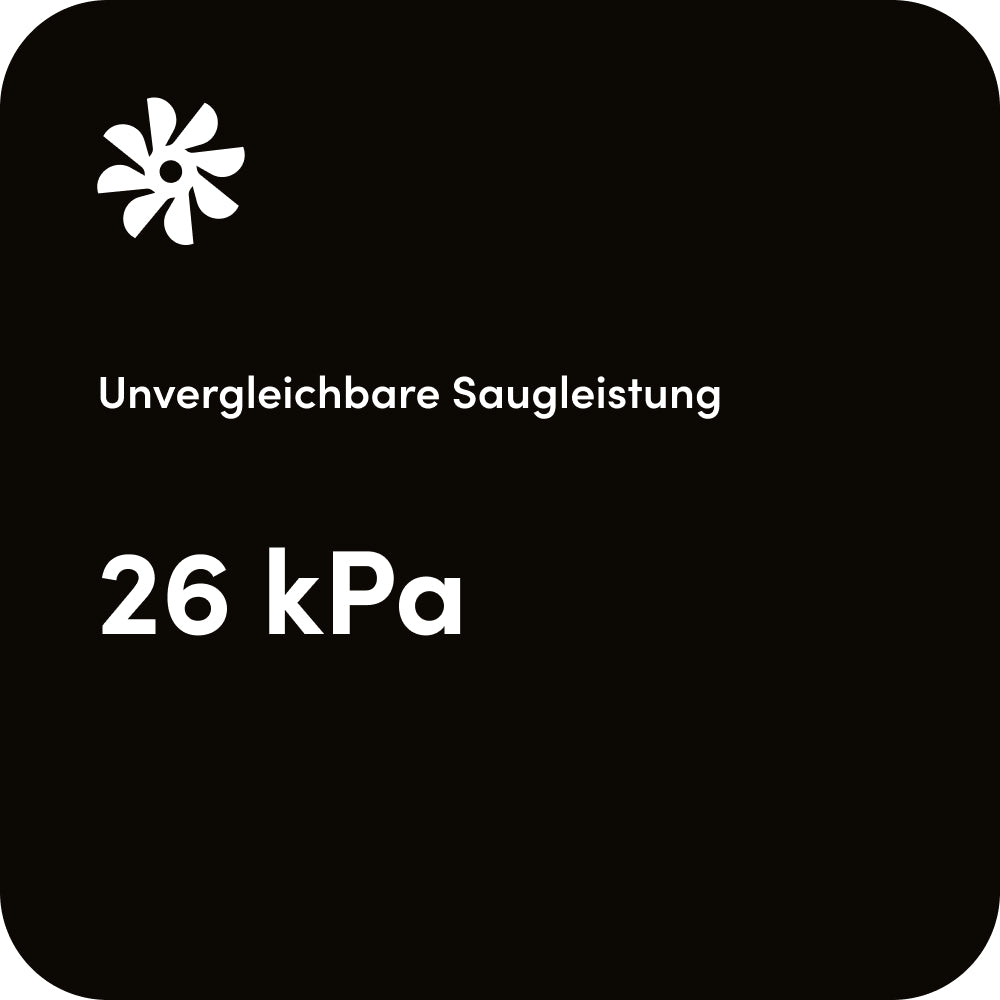 - Unvergleichliche Saugleistung mit 26 kPa – kraftvoll gegen Staub, Krümel und Tierhaare